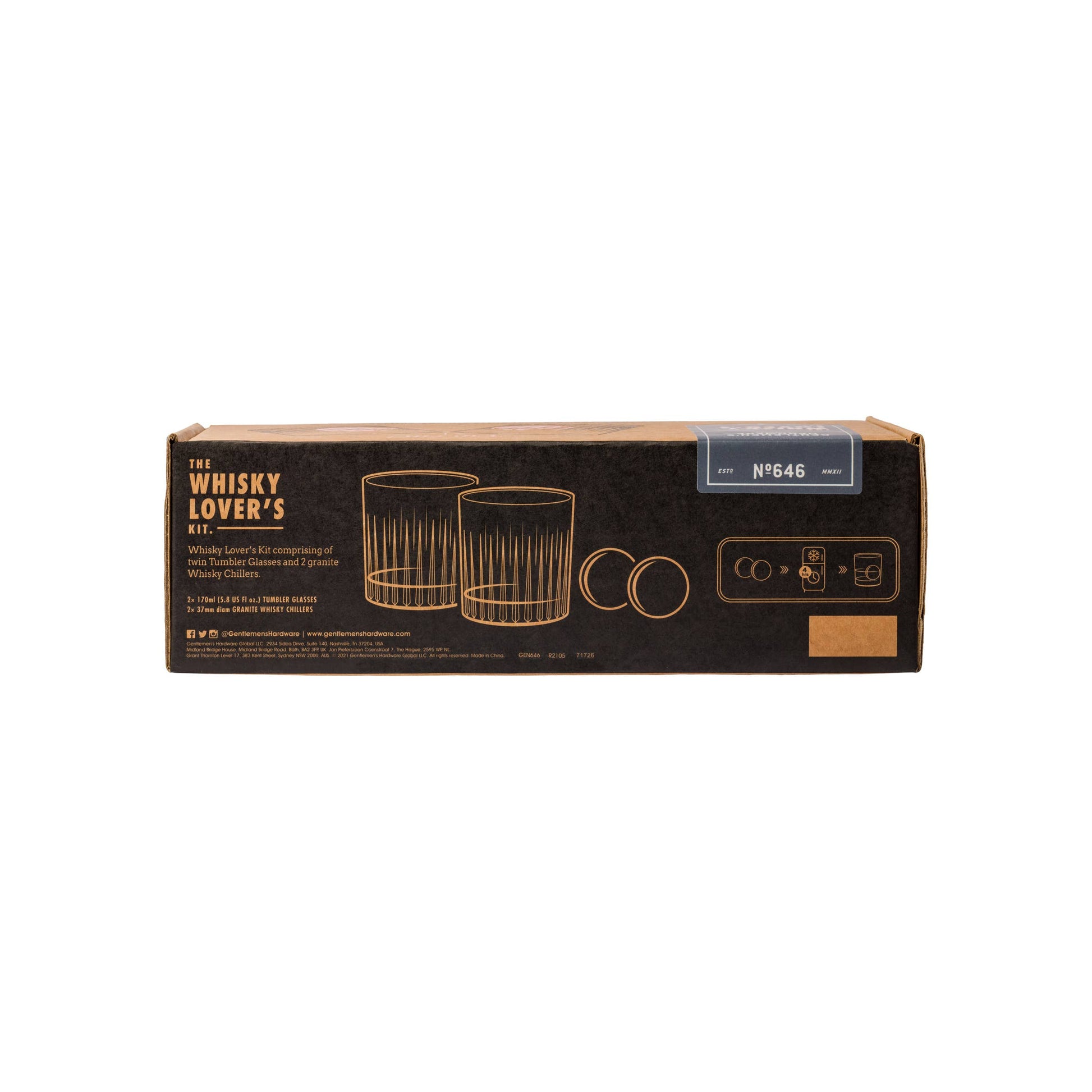 Whisky Lover’s Kit includes twin tumbler glasses and two granite spherical whisky chiller stones.
