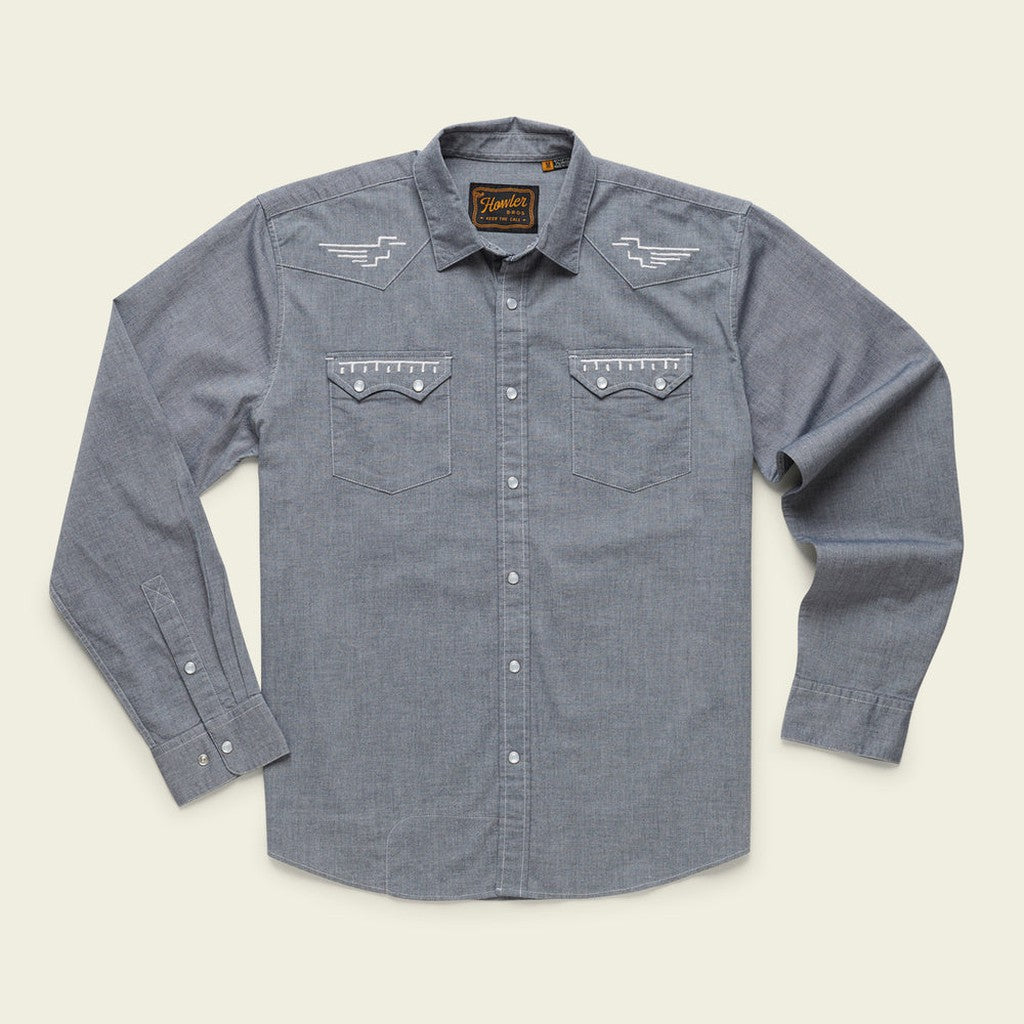 The Crosscut Deluxe is the most sought after item in our fall line year in and year out. Yes, the vintage inspired motif embroidery makes a big statement but so too do the bountiful pearl snaps, western yokes and robust stretch chambray. Collect these right along with your Gauchos for year-round Howler coverage.